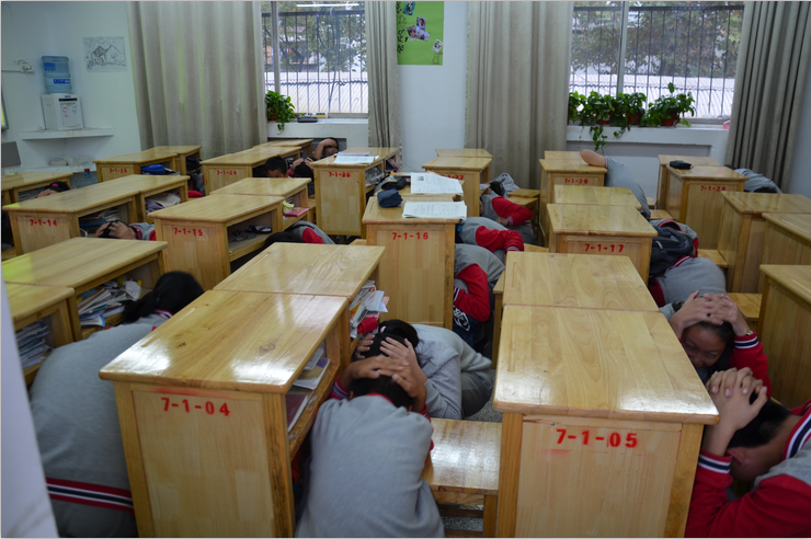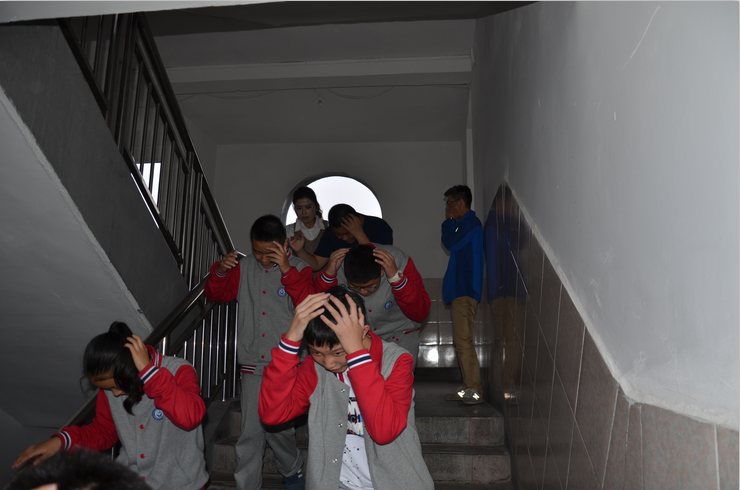 16点40分,随着校园广播警报鸣笛声一响,演习开始了。各班班主任立即组织学生采取自救措施:迅速抱头、闭眼、躲在教室内各自的课桌下或课桌旁,尽量蜷曲身体,降低身体重心,保持安静,听从指挥。当校园广播发出疏散指令时,各班学生在老师的带领下,快速有序地经过安全出口下楼,全校220名学生安全疏散到操场上班级集结位置仅用时1分05秒。